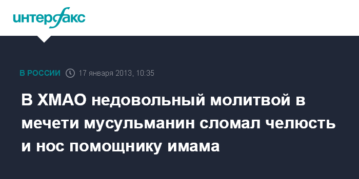 Ханты-Мансийск. 17 января. INTERFAX.RU - Помощник имама в Нефтеюганске (Ханты-Мансийский автомномный округ) был избит в среду в своем кабинете посетителем, которому не понравилась молитва в мечети, сообщил агентству "Интерфакс-Урал" муфтий ХМАО Тагир-хазрат Саматов.
