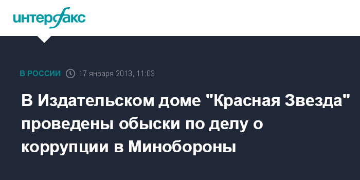 Москва. 17 января. INTERFAX.RU - Правоохранительные органы провели в среду обыски в ОАО Издательский дом "Красная Звезда", входящем в АО "Оборонсервис", сообщил "Интерфаксу" в четверг источник, знакомый с ситуацией.