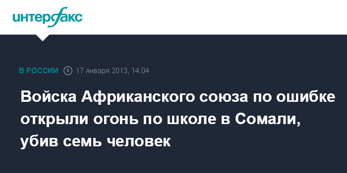 Каир. 17 января. INTERFAX.RU - Войска Африканского союза в Сомали во время погони за местными боевиками по ошибке открыли огонь по религиозной школе, в результате чего погибли семь человек, в том числе пять детей, сообщаил в четверг Associated Press со ссылкой на представителя местного парламента Дахира Амина Джесова.