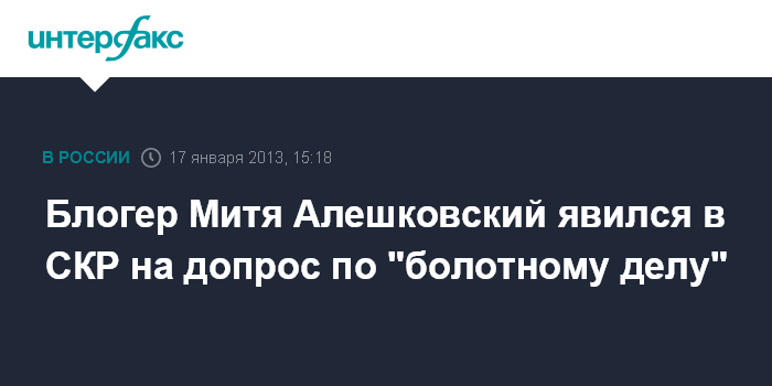 "В соответствии со ст.188 УПК РФ Вам надлежит прибыть 17 января 2013 года к 14:00 в Главное следственное управление Следственного комитета РФ",- говорится в тексте повестки, которую Алешковский разместил в своем блоге во вторник. На допрос он вызван в качестве свидетеля.