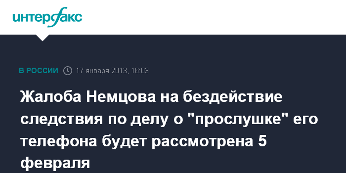 Немцов в своей жалобе заявил о незаконности отказа возбудить уголовное дело по ст.137 УК РФ (нарушение неприкосновенности частной жизни) и невыдачи ему постановления о признании его потерпевшим по уголовному делу по ст.138 УК РФ (нарушение тайны переговоров).