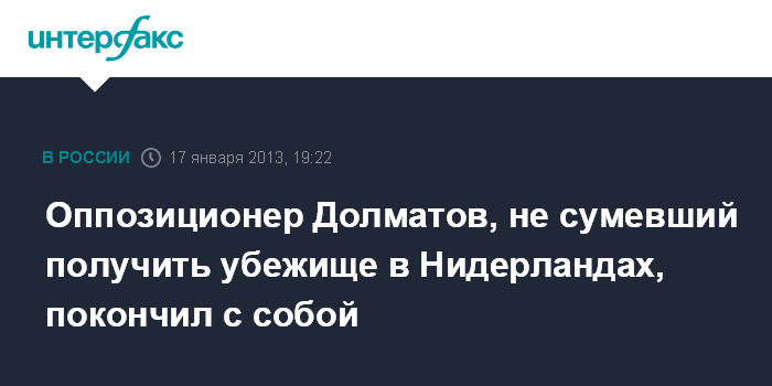 Москва. 17 января. INTERFAX.RU - Активист незарегистрированной партии "Другая Россия" Александр Долматов, попросивший политическое убежище в Нидерландах, по некоторым данным, покончил жизнь самоубийством.