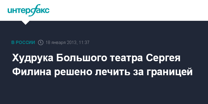 Москва. 18 января. INTERFAX.RU - Попечительский совет Большого театра принял решение о переводе художественного руководителя балетной труппы Сергея Филина в одну из зарубежных клиник, сообщил в пятницу "Интерфаксу" источник в театре.