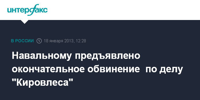 Москва. 18 января. INTERFAX.RU - Оппозиционеру Алексею Навальному предъявлено обвинение в окончательной редакции по уголовному делу о хищениях на предприятии "Кировлес", сообщил "Интерфаксу" официальный представитель СК РФ Владимир Маркин.