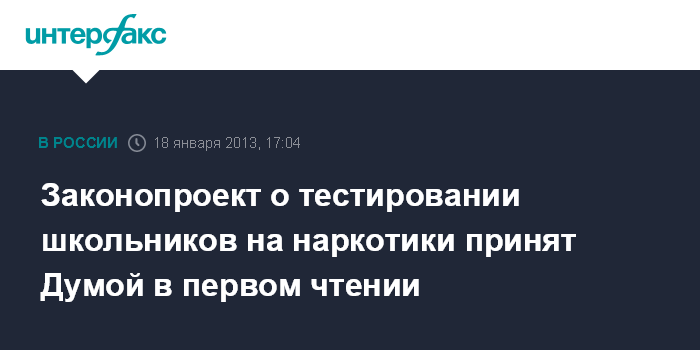 Москва. 18 января. INTERFAX.RU - Госдума в пятницу приняла в первом чтении правительственный законопроект, которым предлагается ввести тестирование учащихся на употребление наркотиков и психотропных веществ.