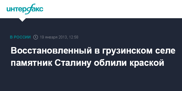 Тбилиси. 19 января. INTERFAX.RU - Неизвестные в ночь на субботу облили розовой краской недавно восстановленный памятник Иосифу Сталину в селе Земо Алвани (Восточная Грузия). Памятник был восстановлен к очередной годовщине со дня рождения Сталина 21 декабря, на церемонии его открытия присутствовали лидеры нескольких оппозиционных партий левого толка.