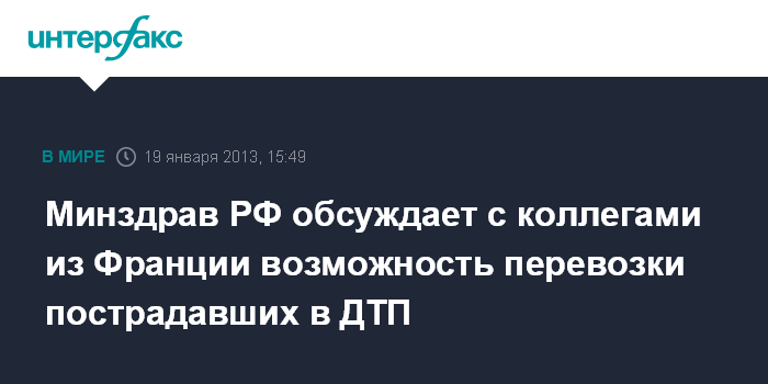 Москва. 19 января. INTERFAX.RU - Минздрав России вышел на контакт с коллегами из Франции для оценки состояния российских туристов, пострадавших в ДТП во Франции, и оценки возможностей их транспортировки на родину, сообщили в министерстве.