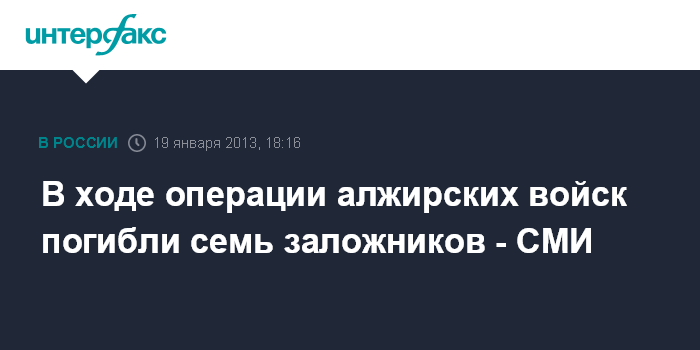 Алжир. 19 января. INTERFAX.RU - Не менее семи заложников погибли на газовом объекте в Алжире в ходе финальной части операции алжирских войск по их освобождению, сообщает в субботу местное агентство APS. Заложники были убиты похитителями, когда военнослужащие пытались их освободить. О национальности погибших заложников не сообщается. Агентство отмечает, что в ходе спецоперации удалось уничтожить 11 боевиков.