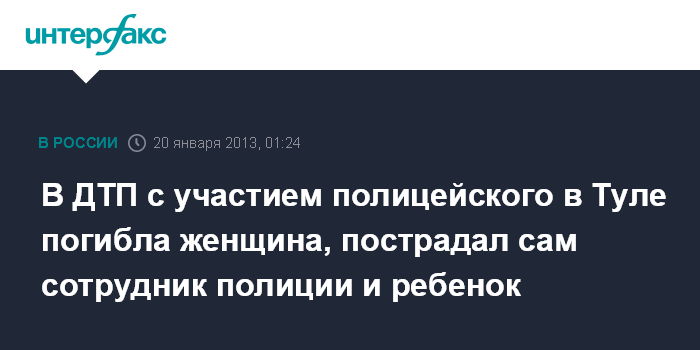 Тула. 20 января. ИНТЕРФАКС-ЦЕНТР - Один человек погиб, двое получили ранения в результате ДТП с участием полицейского, сообщил "Интерфаксу" в воскресенье руководитель пресс-службы областного УМВД Андрей Ярцев.
