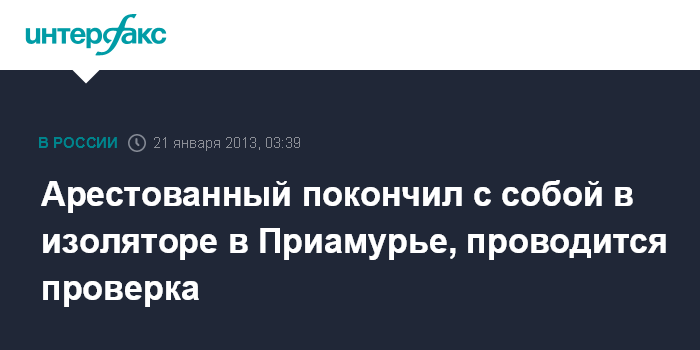 Благовещенск. 21 января. ИНТЕРФАКС-ДАЛЬНИЙ ВОСТОК - В Приамурье в камере изолятора временного содержания МВД "Мазановский" обнаружено тело 19-летнего арестованного, покончившего жизнь самоубийством, сообщает пресс-служба УМВД по Амурской области в понедельник.