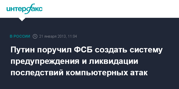 Москва. 21 января. INTERFAX.RU - Президент России Владимир Путин поручил ФСБ создать госсистему обнаружения, предупреждения и ликвидации последствий компьютерных атак на информационные ресурсы РФ.