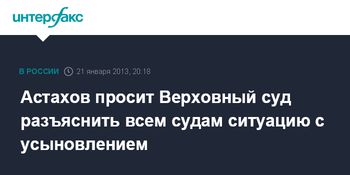 Москва. 21 января. INTERFAX.RU - Уполномоченный по правам ребенка при президенте РФ Павел Астахов направил обращение председателю Верховного суда, чтобы тот разъяснил всем судам, как следует принимать решения по усыновлению детей американцами, которое запрещено с 1 января 2013 года.
