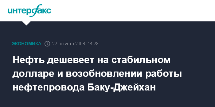 Москва. 22 августа. INTERFAX.RU - Нефть дешевеет на стабильном долларе и возобновлении работы нефтепровода Баку-Джейхан, сообщило агентство Bloomberg.
