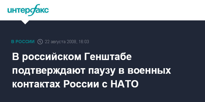 Москва. 22 августа. INTERFAX.RU - Замглавы Генштаба ВС РФ Анатолий Ноговицын подтвердил временное замораживание Россией военных контактов с НАТО. "Да, такое решение имеется. Мы действительно воздерживаемся от принятия участия (в подобных контактах - ИФ) - это вынужденный ответный шаг. Не мы все это инспирировали", - заявил он на пресс-конференции в Москве в пятницу.