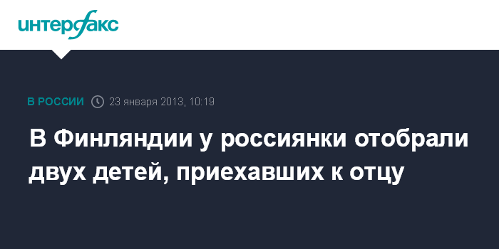 Хельсинки. 23 января. INTERFAX.RU - В Финляндии власти отняли у россиянки Светланы Карелиной двух детей, приехавших в конце ноября по туристической визе на две недели к проживающему в Финляндии отцу, сообщил в среду "Интерфаксу" финский правозащитник Йохан Бекман.