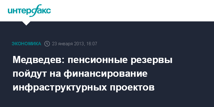 Давос. 23 января. INTERFAX.RU - Россия решила использовать пенсионные резервы для финансирования инфраструктурных проектов, заявил премьер-министр Дмитрий Медведев.