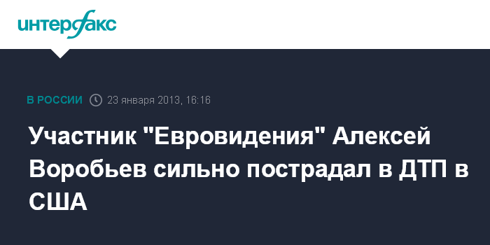 Тула. 23 января. INTERFAX.RU - Российский певец, участник Евровидения, Алексей Воробьев попал в автомобильную аварию в Лос-Анджелесе (США) и находится в реанимации в местной больнице, сообщил "Интерфаксу" источник в правительстве Тульской области.