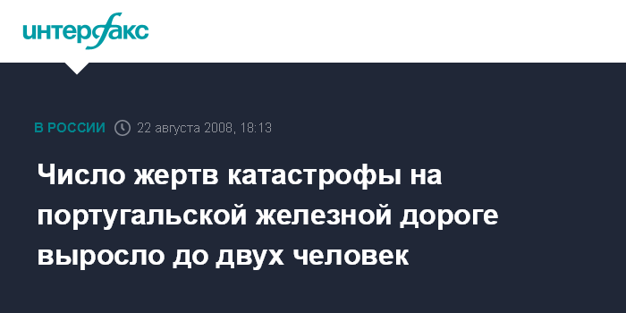 Лиссабон. 22 августа. INTERFAX.RU - Количество погибших в результате катастрофы на железной дороге близ португальского города Брагансы увеличилось до двух человек, передает португальская радиостанция TSF. Еще 40 человек получили травмы, двое находятся в тяжелом состоянии.