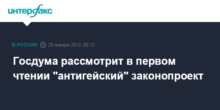 Москва. 25 января. INTERFAX.RU - Госдума в пятницу рассмотрит в первом чтении законопроект о запрете пропаганды гомосексуализма среди несовершеннолетних.