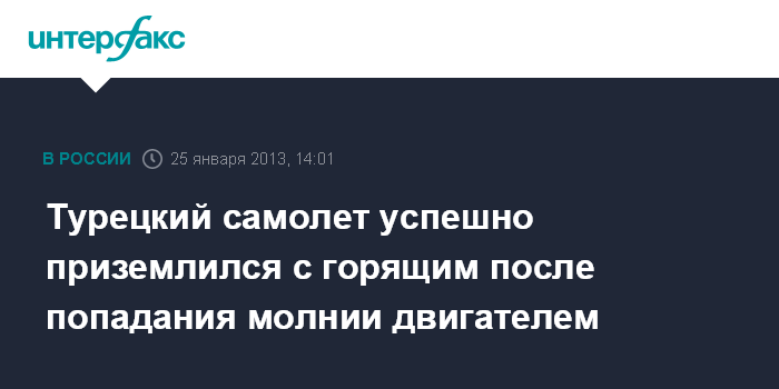Стамбул. 25 января. INTERFAX.RU - В самолет турецких авиалиний, совершавший рейс из Стамбула в Измир, ударила молния, сообщают местные СМИ. Как сообщается, никто из 114 человек, находящихся на борту самолета, не пострадал.