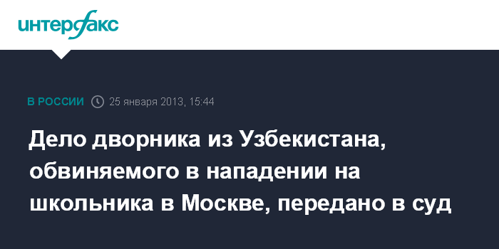 Москва. 25 января. INTERFAX.RU - Уголовное дело в отношении гражданина Узбекистана Бахрома Хуррамова, обвиняемого в нанесении телесных повреждений школьнику, направлено в Зюзинский районный суд для рассмотрения дела по существу.