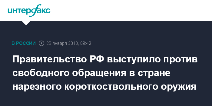 Как говорится в официальном отзыве на законопроект "О внесении изменений в федеральный закон "Об оружии", размещенном в субботу сайт правительства, "свободное обращение огнестрельного нарезного короткоствольного оружия окажет негативное влияние на состояние общественной безопасности в стране, повлечет за собой существенное осложнение состояния правопорядка и рост преступлений, совершаемых с его использованием либо с целью завладения им".