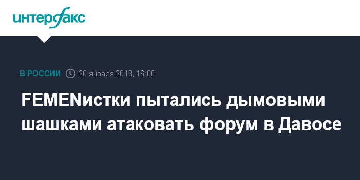 Как отмечается в пресс-релизе движения, распространенном в субботу, FEMENистки "от имени всех женщин планеты подали сигнал SOS давосским заговорщикам". "Прорвавшись максимально близко к основному павильону Всемирного экономического форума в Давосе, секстремистки активировали красные сигнальные дымовые шашки", - говорится в сообщении. Эта информация подтверждается и фотографиями движения.