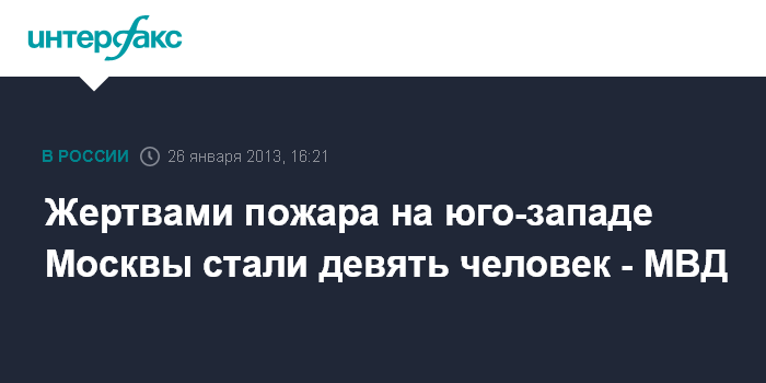 Москва. 26 января. INTERFAX.RU - По уточненным данным столичного главка МВД, в результате пожара на Херсонской улице в Москве погибло девять человек. "В результате пожара погибли девять человек, еще 13 пострадали, из этих 13 двое находятся в тяжелом состоянии", - сообщили "Интерфаксу" в пресс-службе ГУ МВД РФ по Москве.