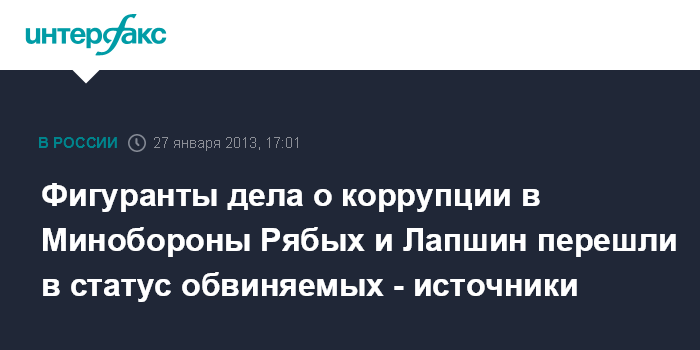 Москва. 27 января. INTERFAX.RU - Следователи предъявили официальное обвинение в мошенничестве в особо крупном размере фигурантам уголовного дела о коррупции в структурах Минобороны - врио начальника ХОЗУ военного ведомства Николаю Рябых и директору департамента текущего ремонта компании "Славянка" Константину Лапшину, сообщили "Интерфаксу" источники, знакомые с ситуацией.