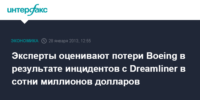 Нью-Йорк. 28 января. INTERFAX.RU - Мировые регуляторы продолжают расследование причин инцидентов с самолетами Boeing-787 Dreamliner, в то время как инвесторы и аналитики пытаются оценить, насколько значительные потери понесет в результате этого Boeing.