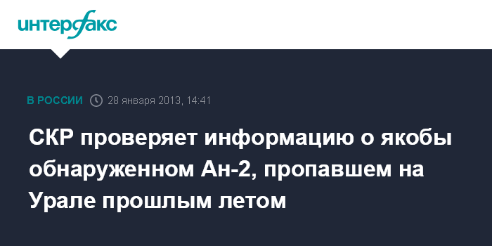 "26 января в СМИ опубликована информация о получении жителем города Нижнего Тагила сведений о местонахождении самолета Ан-2, пропавшего в июне 2012 года в Серовском районе Свердловской области с пассажирами на борту", - говорится в сообщении СКР, поступившем в понедельник в "Интерфакс".