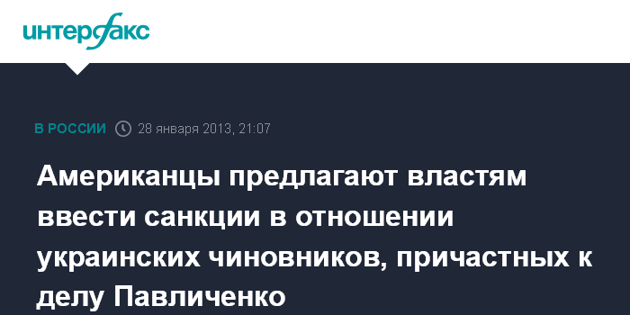 Киев. 28 января. INTERFAX.RU- Американским властям предлагают рассмотреть возможность введения санкций в отношении лиц, причастных к фальсификации дела, касающегося бизнесмена Дмитрия Павличенко и его сына Сергея, которые были признаны виновными в убийстве судьи.