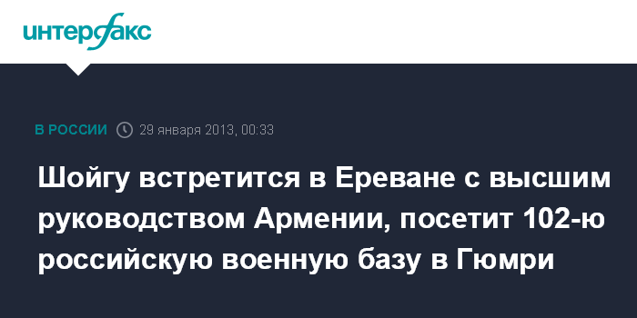 По ее словам, "29 января в рамках визита генерал армии С.Шойгу также посетит 102-ю российскую военную базу (г. Гюмри), где ему будет доложено об организации боевой подготовки, состоянии учебно-материальной базы и инфраструктуры соединения, условиях службы и быта военнослужащих".