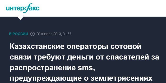 Алма-Ата. 29 января. ИНТЕРФАКС-КАЗАХСТАН - Казахстанские службы ЧС пока не могут договориться с операторами сотовой связи о рассылке sms-сообщений, которые предупреждали бы о возможных землетрясениях.