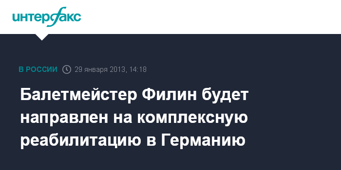 Москва. 29 января. INTERFAX.RU - Художественный руководитель балетной труппы Большого театра Сергей Филин, которому неизвестный плеснул кислотой в глаза, после серии операций в Москве будет направлен для дальнейшего лечения в Германию, сообщили "Интерфаксу" во вторник в Минздраве РФ.
