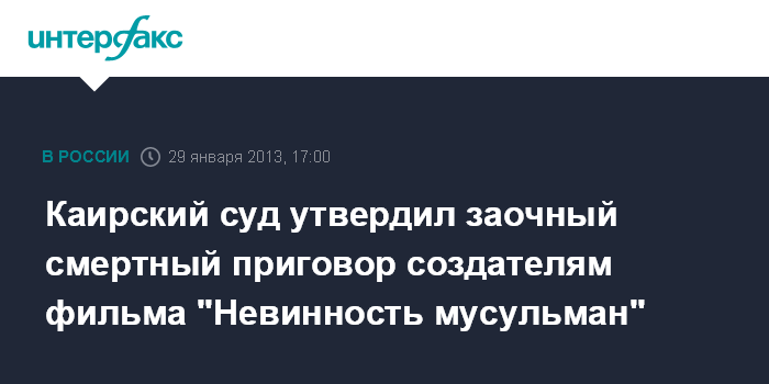 Лондон. 29 января. INTERFAX.RU - Уголовный суд Каира во вторник оставил в силе заочный смертный приговор семерым египетским христианам, принимавшим участие в производстве скандального фильма "Невинность мусульман", сообщает британская телерадиокорпорация BBC