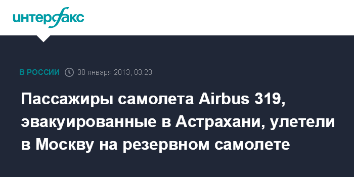 Астрахань/Москва. 30 января. ИНТЕРФАКС-ЮГ - Пассажиры самолета "Airbus 319", эвакуированные в аэропорту Астрахани во вторник вечером из-за сработавших в багажном отделении датчиков тепла, вылетели в Москву на резервным самолетом, сообщили агентству "Интерфакс-Юг" в ГУ МЧС по Астраханской области.