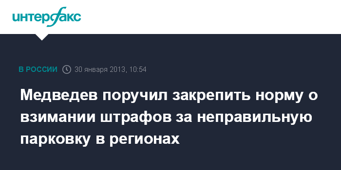 Москва. 30 января. INTERFAX.RU - Премьер-министр РФ Дмитрий Медведев поручил подготовить поправки в законодательство, предусматривающие передачу полномочий по взиманию штрафов за неправильную парковку региональным властям.