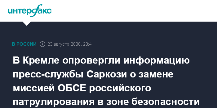 Москва. 23 августа. ИНТЕРФАКС - В пресс-службе Кремля не подтвердили информацию пресс-службы французского президента о том, что Дмитрий Медведев и Николя Саркози договорились о замене миссией ОБСЕ российского патрулирования в зоне безопасности за пределами Южной Осетии.