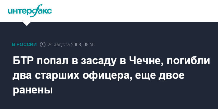Грозный. 24 августа. ИНТЕРФАКС - В Чечне подорван бронетранспортер, погибли два старших офицера, сообщил "Интерфаксу" в воскресенье утром источник в правоохранительных органах республики.