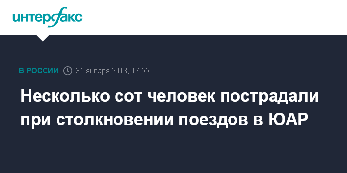 Лондон. 31 января. INTERFAX.RU - Не менее 300 человек получили травмы в результате столкновения двух пассажирских поездов на северо-востоке ЮАР близ города Претории, сообщила BBC в четверг .