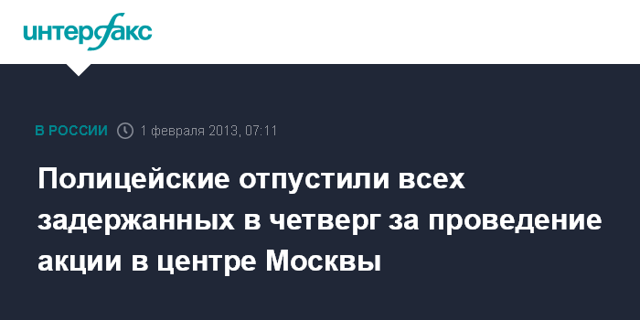 Москва. 1 февраля. ИНТЕРФАКС - Полиция отпустила всех граждан, задержанных в четверг вечером за несанкционированную акцию в центре Москвы, сообщил "Интерфаксу" в пятницу представитель пресс-службы столичного главка МВД.