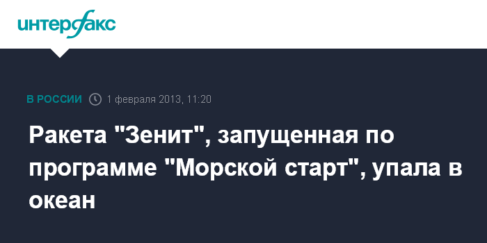Москва. 1 февраля. INTERFAX.RU - Ракета-носитель "Зенит", запущенная с плавучего космодрома в Тихом океане по программе "Морской старт", упала в океан, сообщил "Интерфаксу" источник в ракетно-космической отрасли.