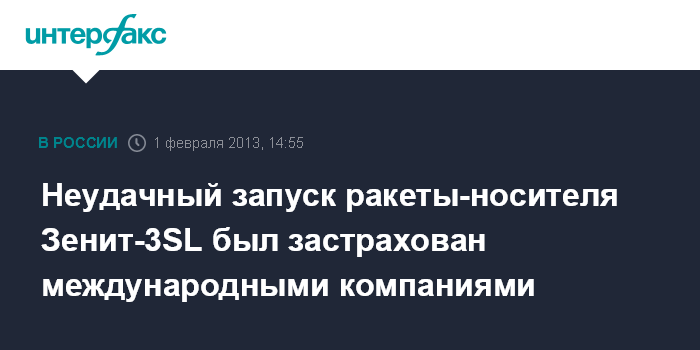 Москва. 1 февраля. INTERFAX.RU - Неудачный запуск ракеты-носителя "Зенит-3SL" был застрахован международными компаниями, сообщил агентству "Интерфакс" источник на страховом рынке. Он добавил, что имущество и ответственность при запуске "Зенит-3SL" российскими страховщиками не страховались.