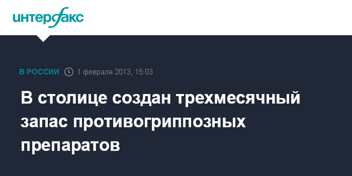 Москва. 1 февраля. INTTERFAX.RU - Лечебно-профилактические учреждения столицы имеют трехмесячный запас противовирусных препаратов, сообщила глава столичного управления Роспотребнадзора Елена Андреева.