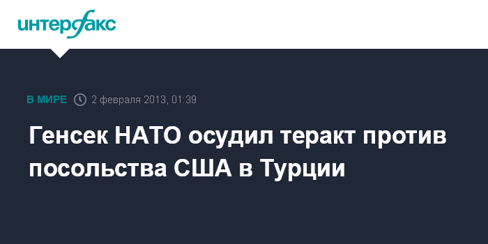 Брюссель. 2 февраля. ИНТЕРФАКС - По мнению генерального секретаря Североатлантического альянса Андерса Фог Расмуссена, взрыв у американского посольства в Турции 1 февраля является недопустимым актом против дипломатической миссии одной из стран НАТО на территории другой страны этой организации.