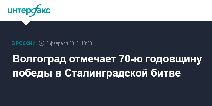 Волгоград. 2 февраля. INTERFAX.RU - В Волгограде в субботу начались торжества, посвященные 70-й годовщине разгрома немецко-фашистских войск в Сталинградской битве. Как сообщили агентству "Интерфакс-Юг" в региональном правительстве, знаменательная дата широко отмечается в каждом районе региона, но главные события праздничной программы будут сосредоточены в Волгограде.