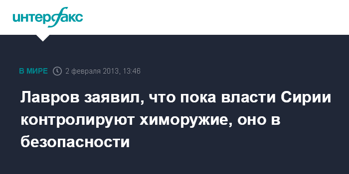 Мюнхен. 2 февраля. INTERFAX.RU - Пока власти Сирии контролируют свое химоружие, оно в безопасности, заявил глава МИД РФ Сергей Лавров. "Мы уверены, что пока правительство сохраняет контроль над этим оружием, ситуация безопасна", - сказал он на Мюнхенской конференции по безопасности в субботу.