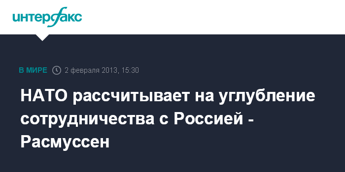 "Я рассчитываю на углубление наших стратегических отношений с Россией, чтобы мы могли построить долгосрочную безопасность и стабильность для всех нас в евроатлантическом сообществе", - отметил А.Ф.Расмуссен в своем докладе о будущем НАТО после 2014 года в субботу на Мюнхенской конференции по безопасности.