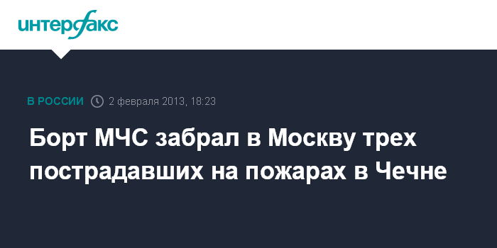 Москва. 2 февраля. INTERFAX.RU - Самолет МЧС России с тремя пострадавшими на пожарах в Чечне вылетел в Москву, сообщили в субботу "Интерфаксу" в управлении информации МЧС РФ.